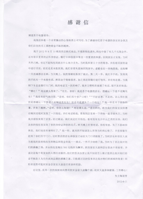 這是一封來(lái)自金太陽(yáng)博望蘇寧電器管理處的感謝信,管理處保安宋師傅夜間巡邏時(shí)發(fā)現(xiàn)一只錢(qián)包,其中有幾千元現(xiàn)金和很多重要證件。宋師傅及時(shí)聯(lián)系該蘇寧電器…